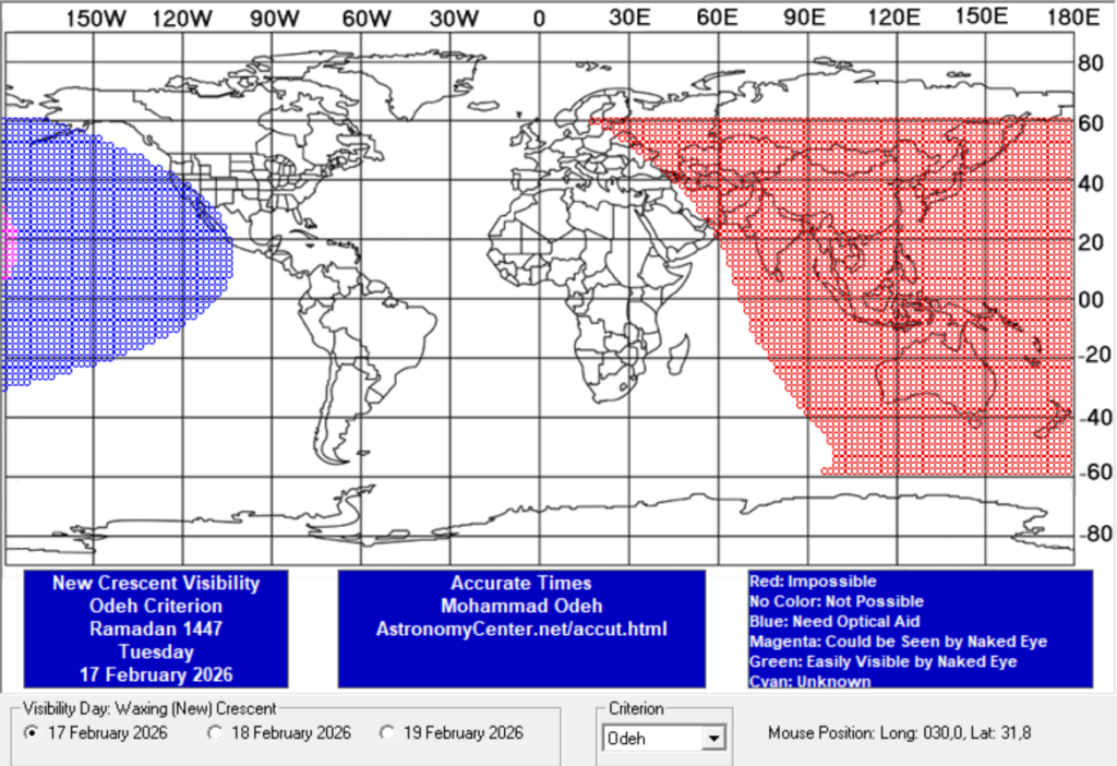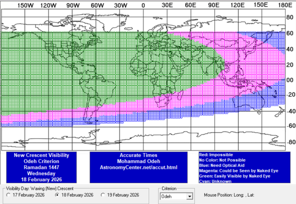 Selon cette méthodologie, on observe sur les cartes ci-jointes que le croissant lunaire ne sera pas visible en France, ni en Europe, ni en Afrique, ni au Proche Orient, ni en Amérique du Sud, ni en Asie le mardi 17 février 2026. En revanche, il sera visible en France et partout dans le monde le mercredi 18 février 2026. Le Coran indique que le jeûne doit débuter après l’observation du premier croissant lunaire (2 : 185 et 2 : 189). Le jeûne débutera donc le jeudi 19 février 2026 à l’aube.