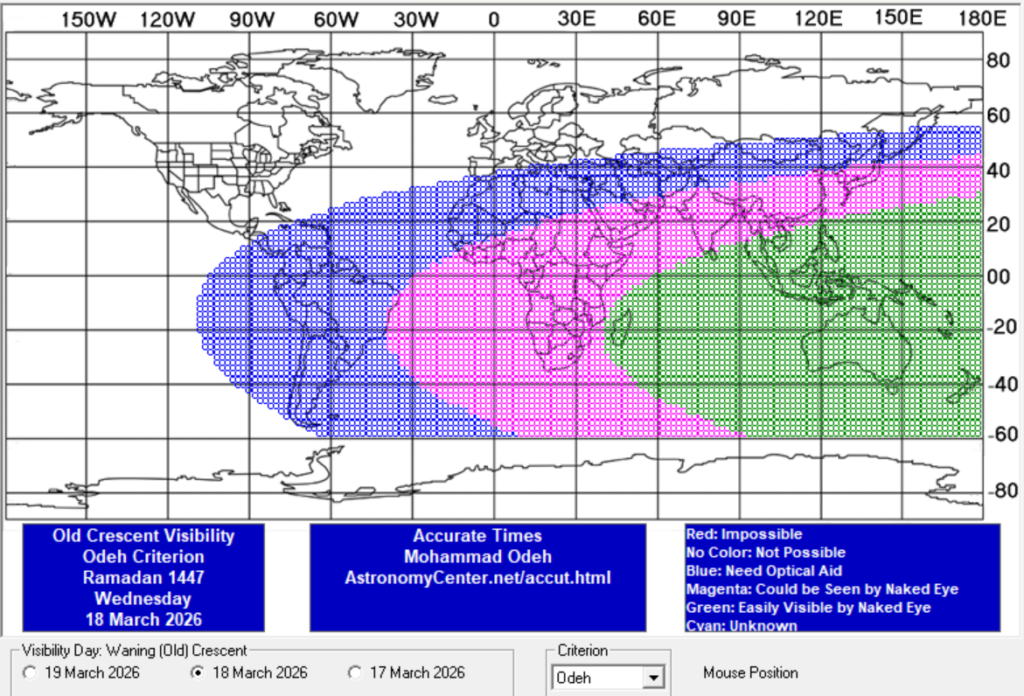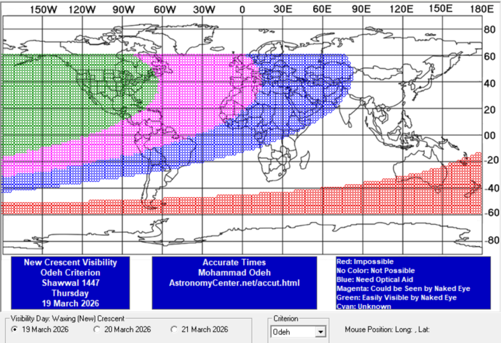 Pour ceux qui ont commencé le mois selon le calcul mondial (mercredi 18 février), le croissant ne sera pas présent le mercredi 18 mars. En revanche il sera présent en Amérique, Europe, Moyen-Orient et une bonne partie de l’Afrique le jeudi 19 mars, et atteindra les 1% à Paris aux alentours de 23h. La fête de la rupture du jeûne sera donc célébrée le vendredi 20 mars.